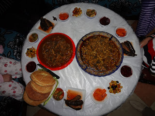 Eid dinner: sheep stomach tajine with several side salads, olives, and of course, bread |